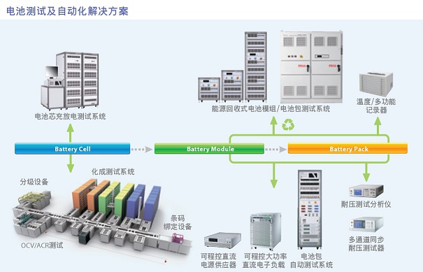 电池测试是一个十分复杂而且关键的过程,需要准确、精细、快速、可靠的测试设备和系统。而Chroma电子所提供的电池测试方案,则具备全面性、多样性和先进性,能够帮助客户进行充电、放电、容量、效率、循环寿命、温度及安全性等方面的综合测试,并实现精确、实时、远程和批量的数据采集和分析。在这个复杂的测试过程中,使用了不同种类的仪器,包括电子负载、电压电流源、直流电源、电池测试仪及自动化测试系统等。