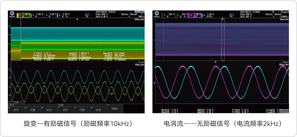 从功能设置参数特性来看,电机模拟器的旋变与电涡流基本控参保持一致,本质区别在于是否需要交流励磁信号,可以根据不同的位置传感来进行模式的切换,以适应不同被测件的测试需求,科威尔M2000-MS系列电机模拟器旋变与电涡流实际模拟测试波形如下: