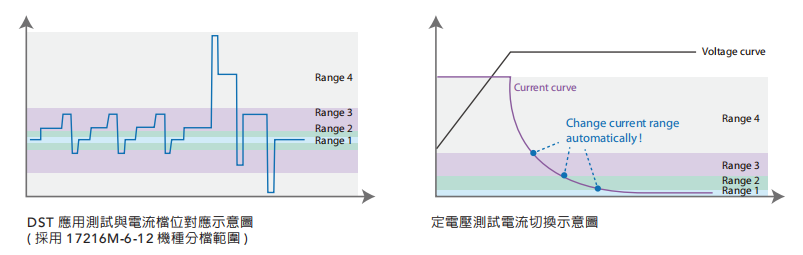 Chroma 17010全系列机种提供多重电流输出及测量档位切换,适合应用于同时涵盖大电流及小电流的测试计划。工步开始执行时,系统会侦测输出电流大小并自动且快速切换合适的电流档位,来提升其测量精度与分辨率以确保测试数据的准确度。
