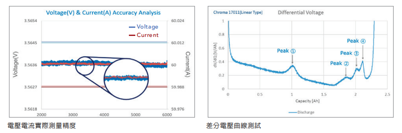 Chroma 17010具备低输出噪声与高测量精度,其测试电流与电压数据可转换成高精确的电压差分曲线及清晰的特征峰,能有效率的研究锂离子电池老化机制。