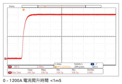 Chroma 17010系统能源回收系列具备0 - 1200A电流爬升时间<1mS的能力,能更真实的模拟电池于行车过程中瞬间峰值电流充放电行为,满足NEDC、FUDS和DST等测试数据。