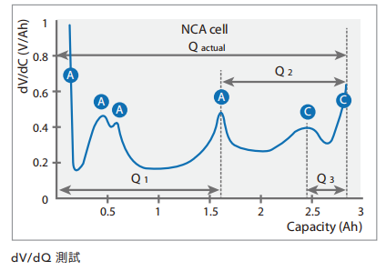 绘制dV/dQ曲线的关键是采用小电流(<C/20)对电池进行充放电,以消除极化因素对测量结果的影响。Chroma 17010低测量噪声的特色能协助使用者绘制高清晰的dV/dQ对应Q的曲线,可细致地观察与标示各特征峰。透过老化实验可以基于各特征峰的偏移与高度来研究电池老化机制。