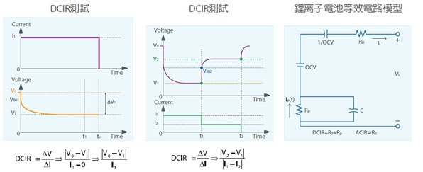 内电阻值的大小关系着动力电池可应用充/放电流 大小,内阻越大效率越差且形成发热温升,传统 使用LCR meter 1Khz 的量测方法,只能评估出接 近Ro(趋近ACIR)的电阻性传导所形成的电池瞬间 电力出输出阻碍,但无法评估在电化学转态时所 产生的延迟,而基于图三之等效电路图,DCIR的 评估即包含ACIR的阻值。故动力电池所使用的电 池芯都应经过DCIR的特性评估。DCIR的评估方式 根据BS EN 61960的精神,可以用此测试波形,利 用二个不同之加载电流之电流差与电压差来计算 DCIR值。