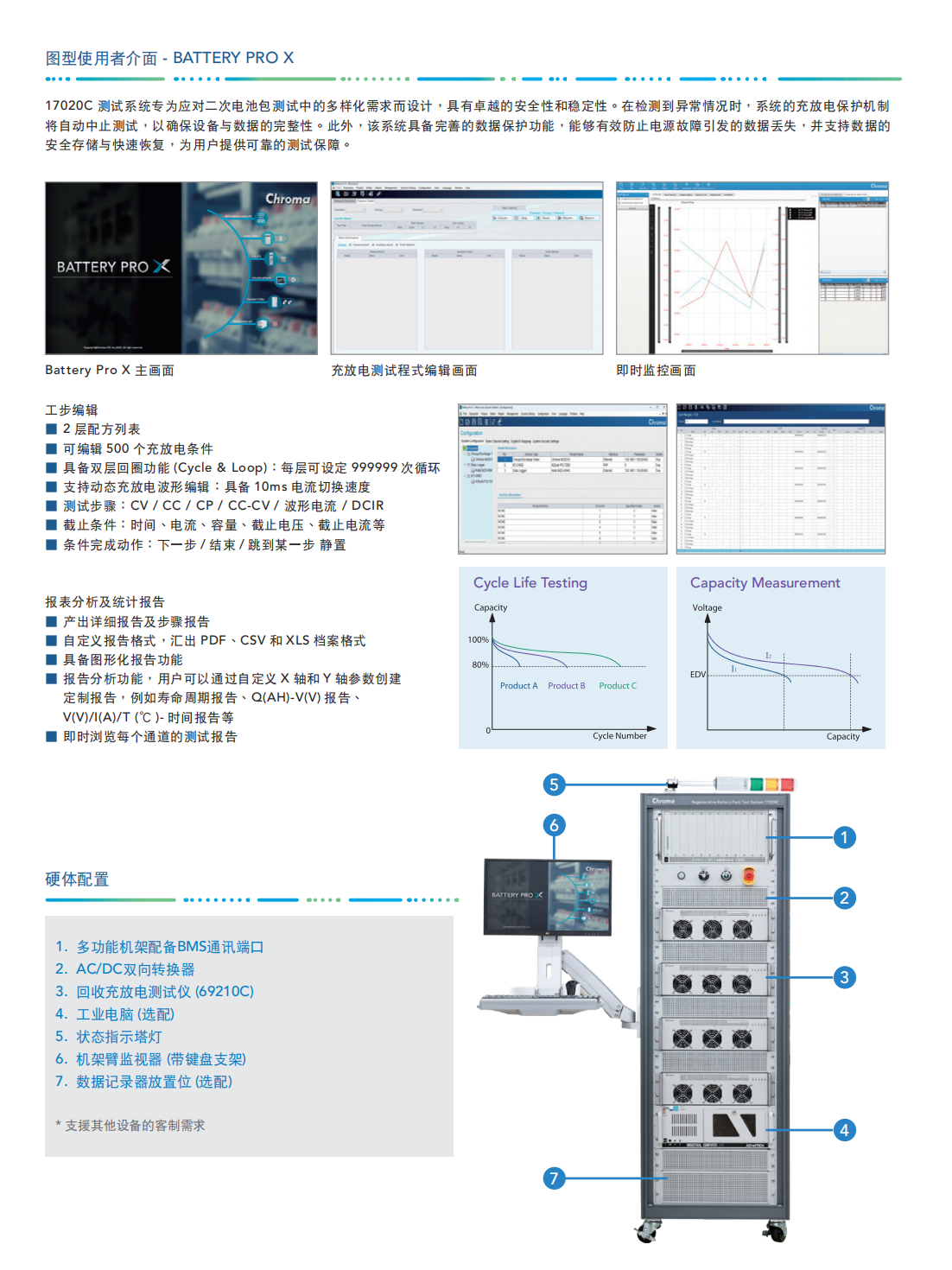 Chroma 17020C系统是专门为二次电池模组及电池包测试设计的高精密设备,适用于电池模组/电池包的续航力试验、产品进出货检验设计验证研究,并可进行生产线上容量学习(Learning)与测试。