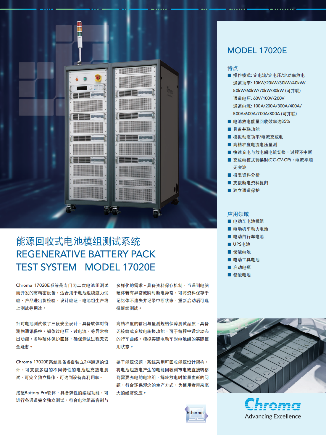 Chroma 17020E系统是专门为二次电池组测试而开发的高精密设备,适合用于电池组续航力试验、产品进出货检验、设计验证、电池组生产线上测试等用途。