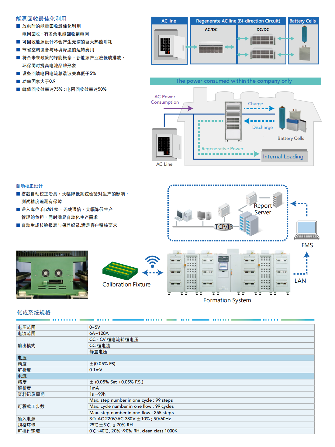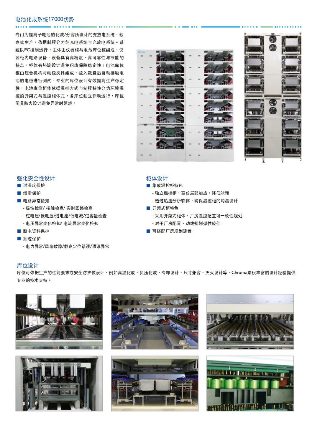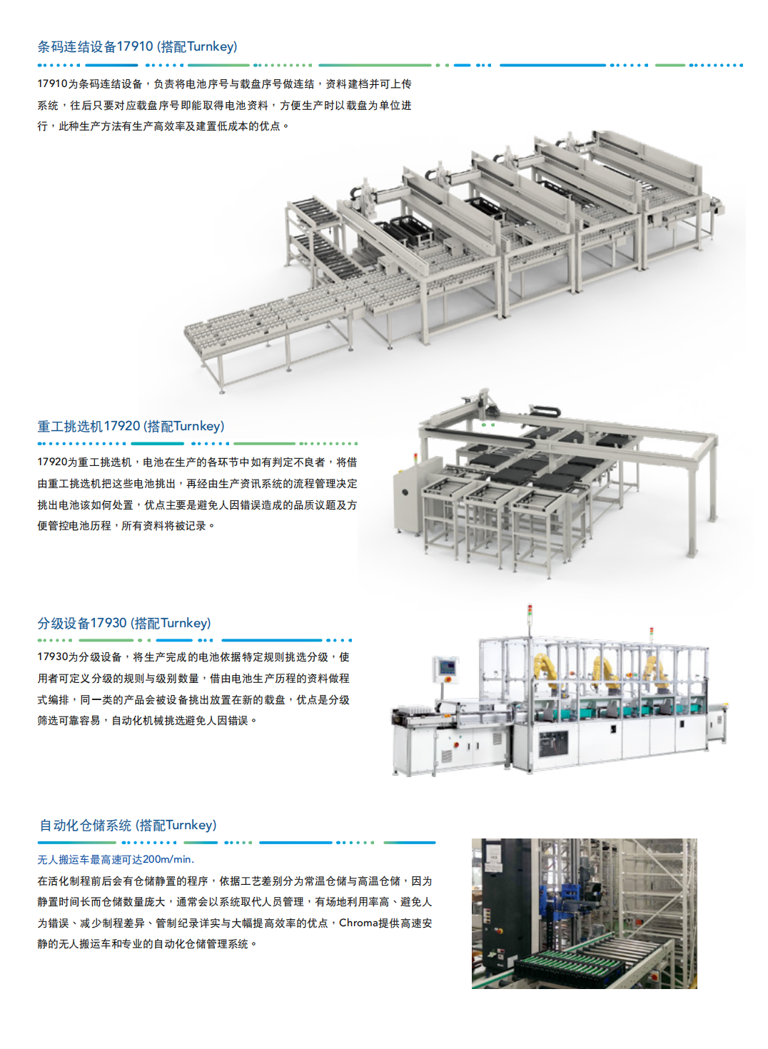 电池化成整体解决方案是Chroma针对电池芯生产线提供的整体规划服务,由活化到分级配对依据制程工艺做最适当的设备或系统性规划,包含仪器设备建构、物流规划、生产管理系统等,提供多样客制功能,量身打造高效益产线。
