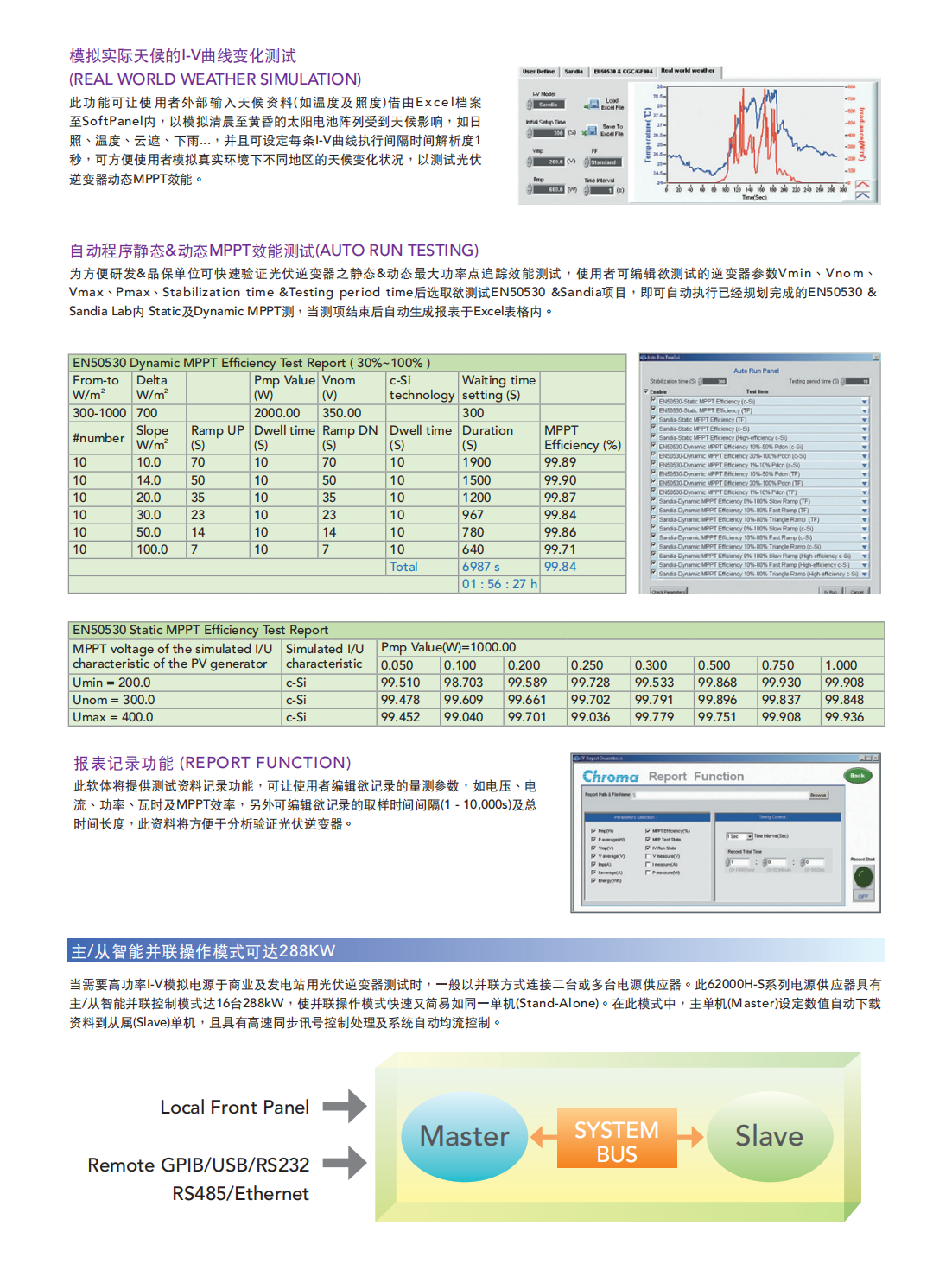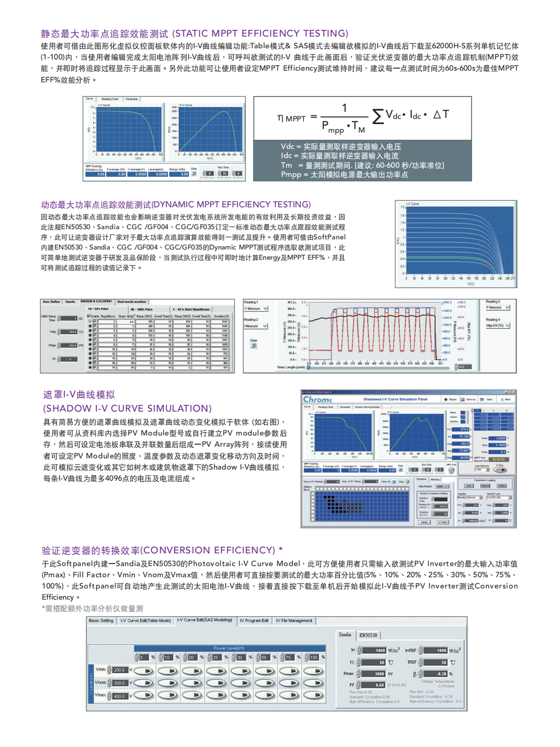 62000H-S系列具备16bit高解析度的数位控制及精准的电压及电流量测机制,并搭配图形化操作软体(Softpanel),此可即时地测试及显示光伏逆变器的最大功率追踪状况,且测试MPPT EFF%读值,另外使用者可选择欲储存的量测读值于软体上。