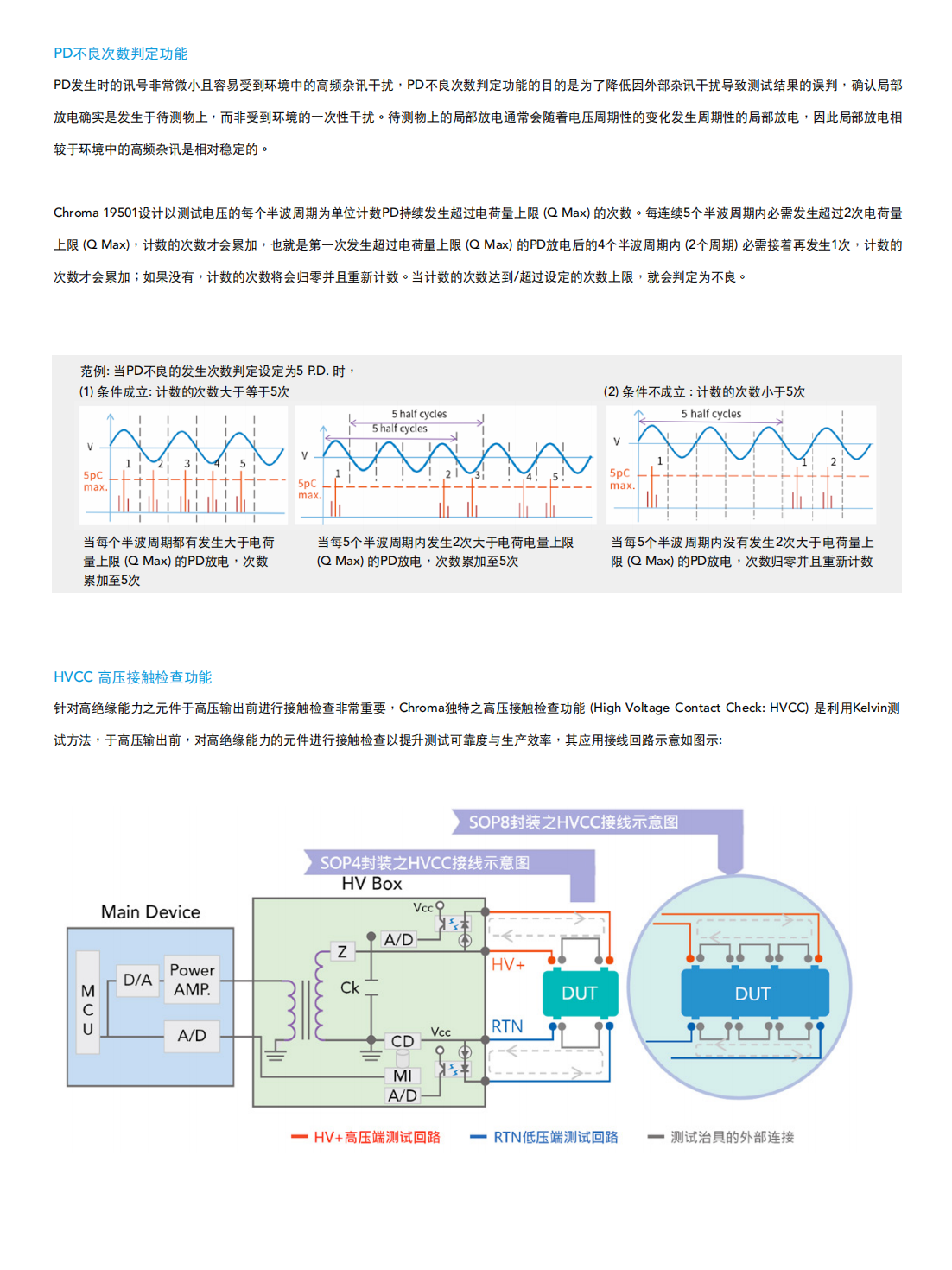 Chroma 19501局部放电测试器可提供交流耐电压测试(Hipot Test)测量待测物上的漏电(Leakage Current)与电气闪络(Flashover),以及提供局部放电(Partial Discharge,PD)测量待测物上局部放电的电荷量(pC)对高压元件与高耐压的绝缘材料进行交流耐电压与局部放电测试,可确保产品的绝缘品质与提升产品的可靠度。
